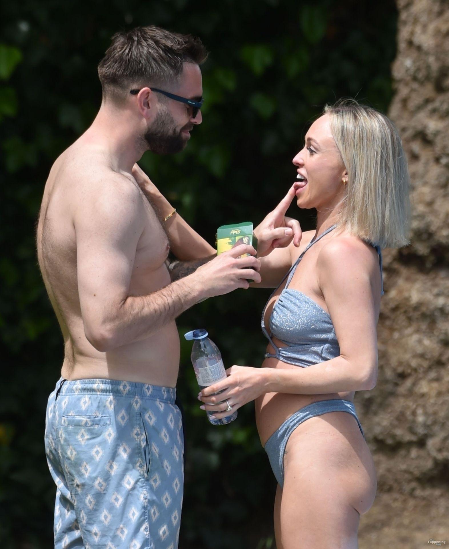 “Hollyoaks” actress Jorgie Porter shows off her bikini body while on holiday with fiancé Ollie Piotrowski in Spain.