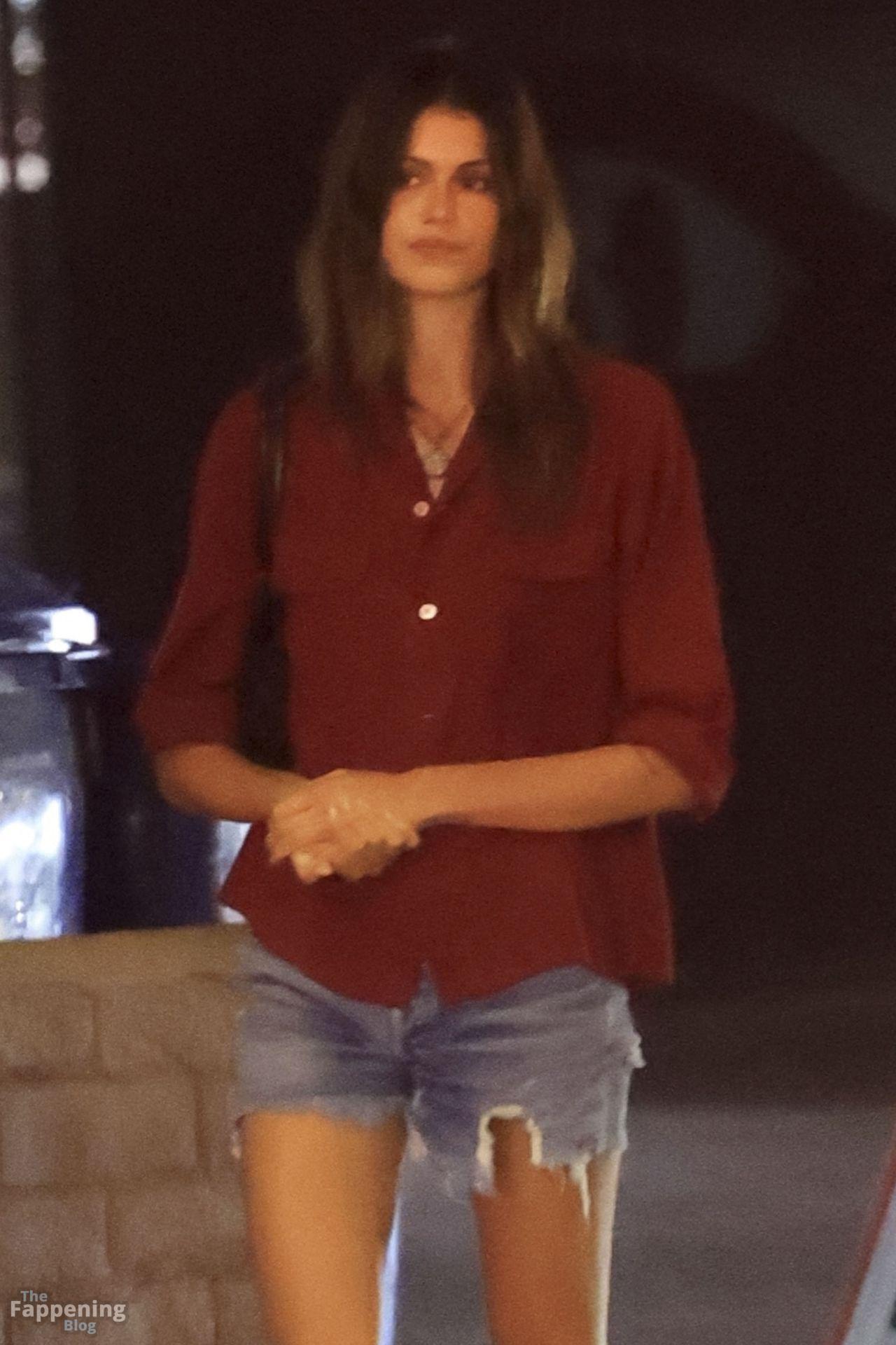 Actress and model Kaia Gerber shows off her long toned legs as she’s spotted leaving a restaurant after having dinner with three of her friends in Los Angeles. The 23-year-old is wearing jean shorts, long black boots and red buttoned up dress shirt.